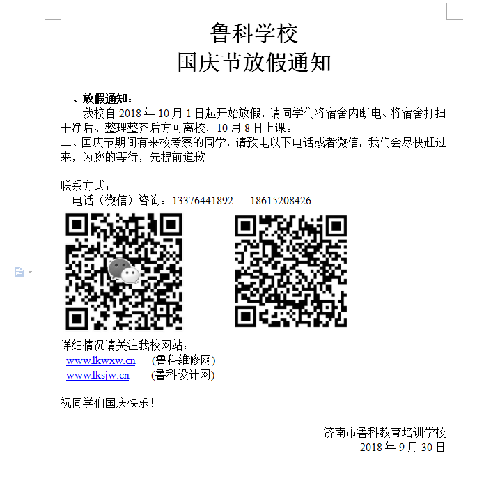 鲁科学校 春节放假通知 一、放假通知: 我校自2018年2月6日起开始放假,放假期间封闭学校,请同学们提前安排买票回家过年,离校时将宿舍内断电、将宿舍打扫干净后整理整齐后方可离校。 二、返校时间: 1班:农历正月初十报到,农历正月十一开学 2班:农历正月十六报到,农历正月十七开学 自正月十七之后每个月开两期新班,分别是每个月(公历)1号或16号固定开学时间,外地生请至少提前一天报到校报到。 三、学费优惠截止时间: 农历正月十六之后恢复原价,请参照我校收费报价公示表。 四、接待学生咨询时间: 农历正月初十开始我校教职工全面复工,考察者自农历正月初十后可以到校考察了。 春节之后开课专业: 1、维修类课程 2、设计类课程 手机维修表 平面设计 电脑维修院 室内设计 家电维修 网页设计 维修全能课程院 影视后期 维修大中专学历班 设计大中专历班 联系方式: 电话(微信)咨询:13376441892 18615208426 详细情况请关注我校网站: www.lkwxw.cn (鲁科维修网) www.lksjw.cn (鲁科设计网) 祝同学们春节快乐!万事如意! 济南市鲁科教育培训学校 2018年2月6日[2018-02-05] 点击:6483