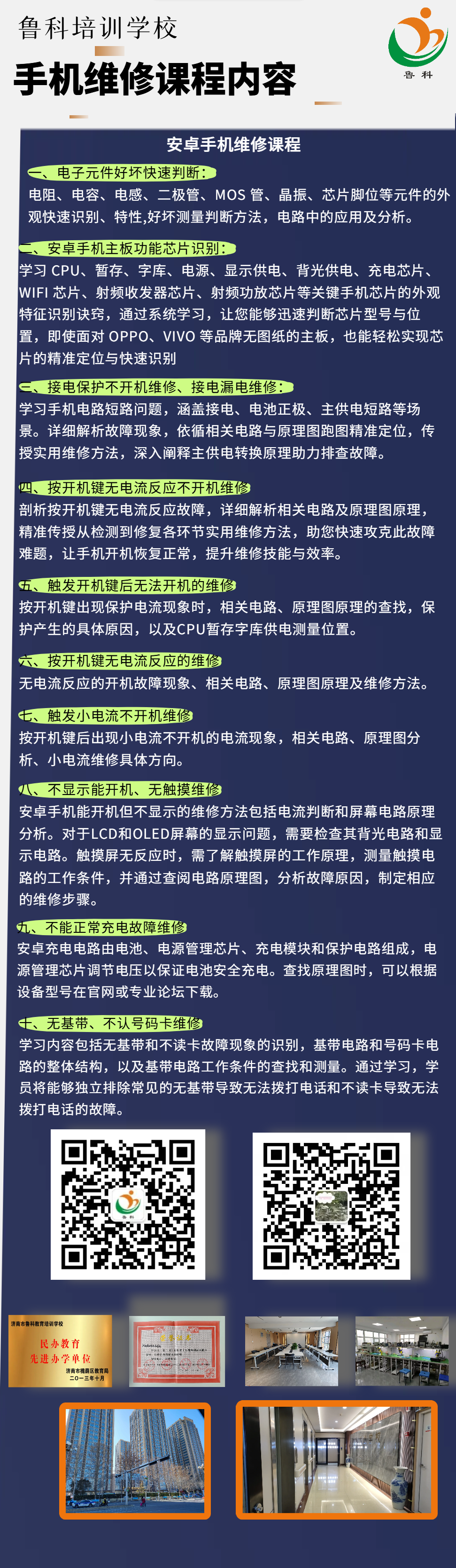 1、软件学习,包括刷机越狱解锁升级等。常见品牌苹果、华为、小米、VIVO、oppo、魅族等机型的刷机,解锁。解账户锁,第三方工具的使用,官方刷机及第三方刷机,学校机房里面学习每人一台电脑学习部分。